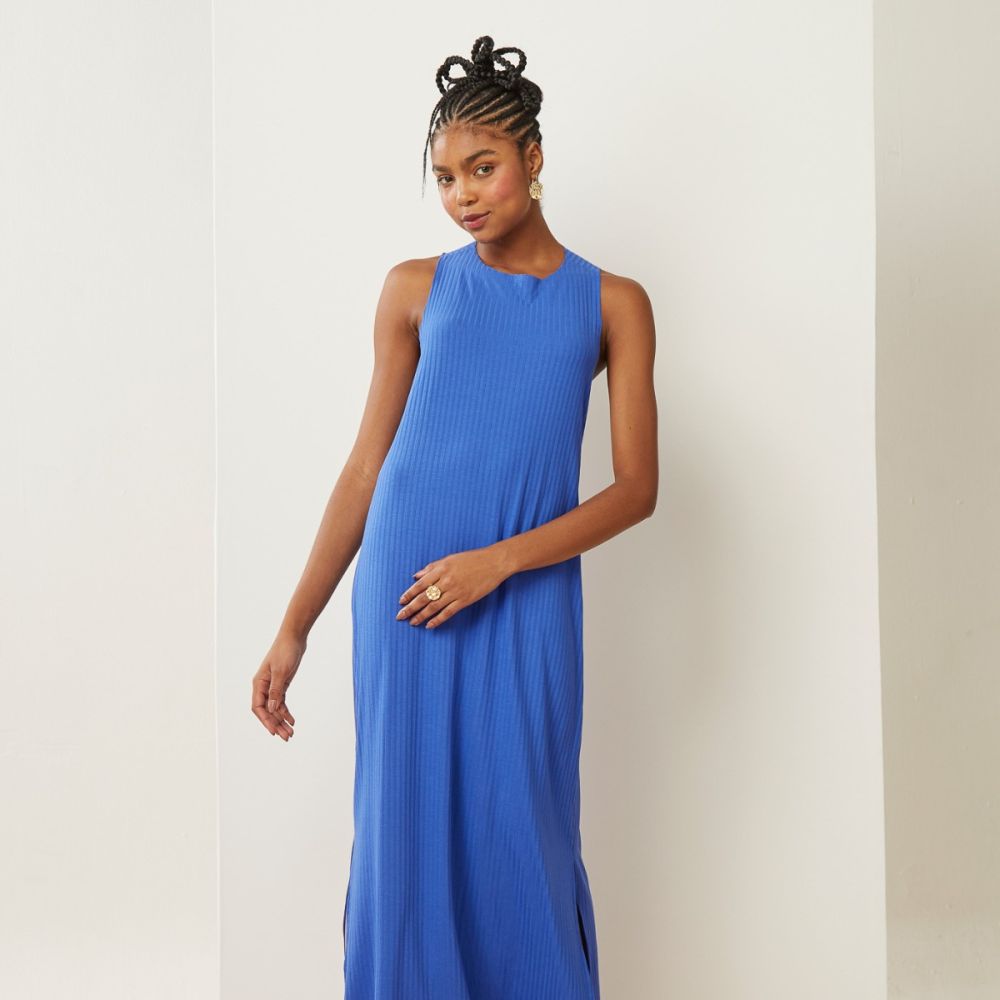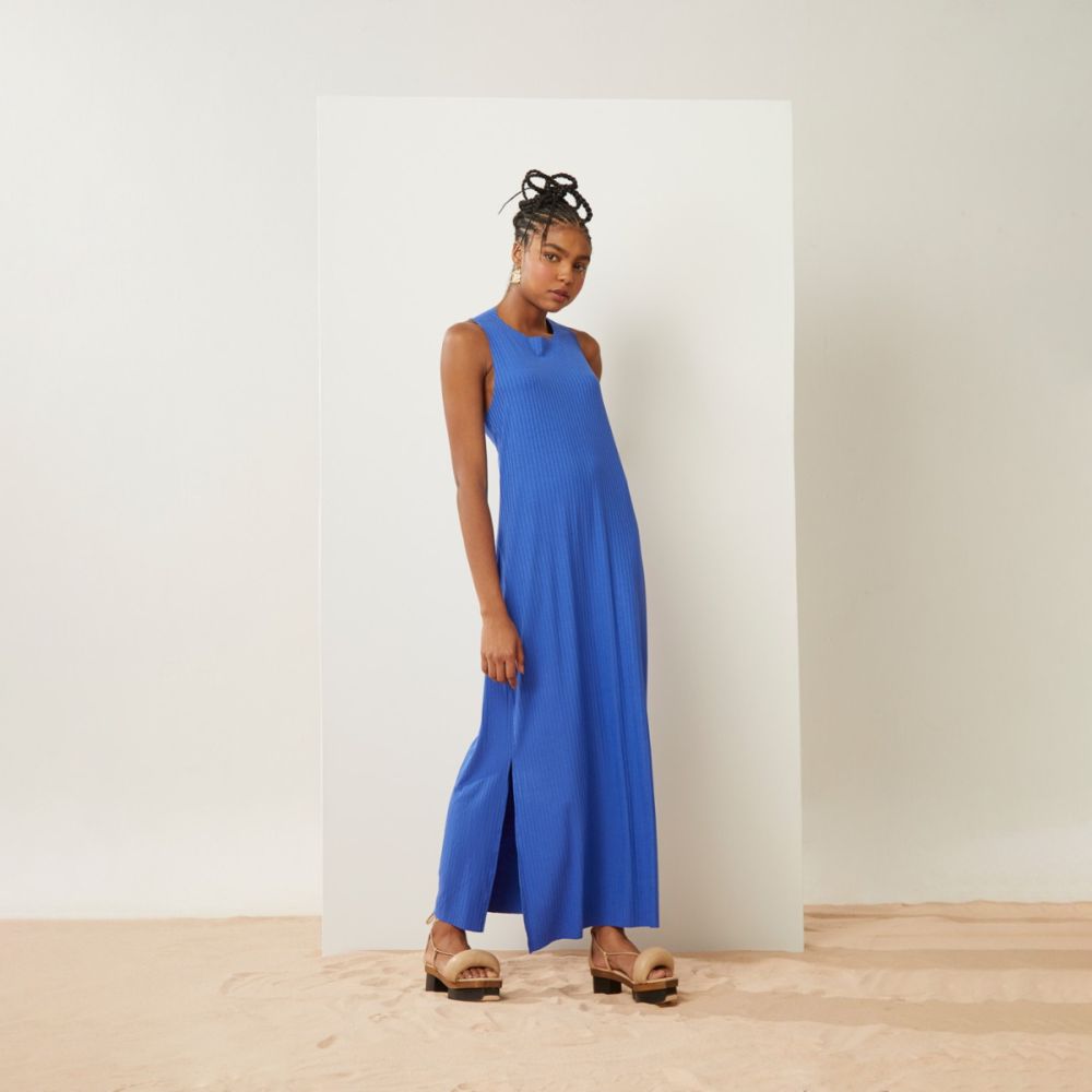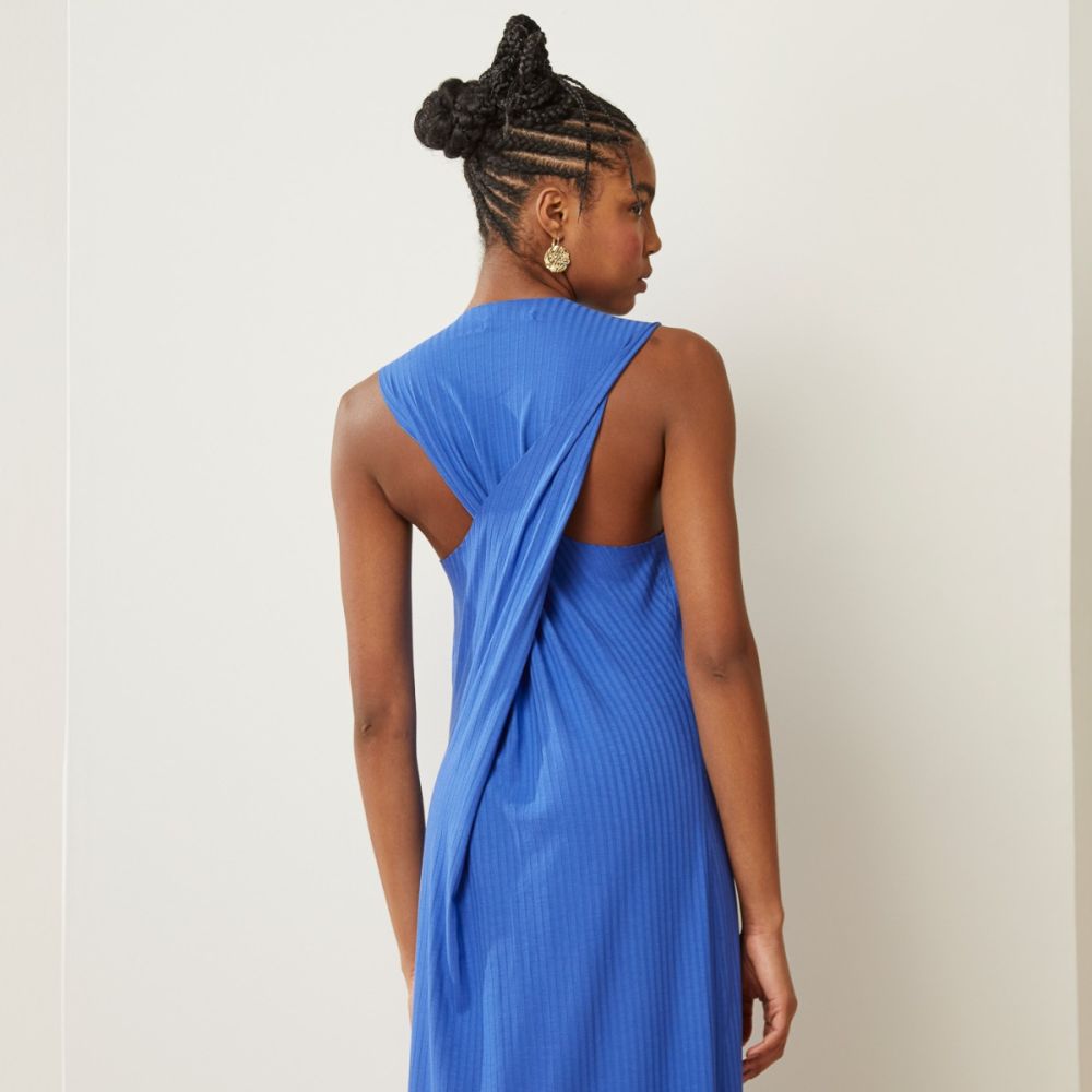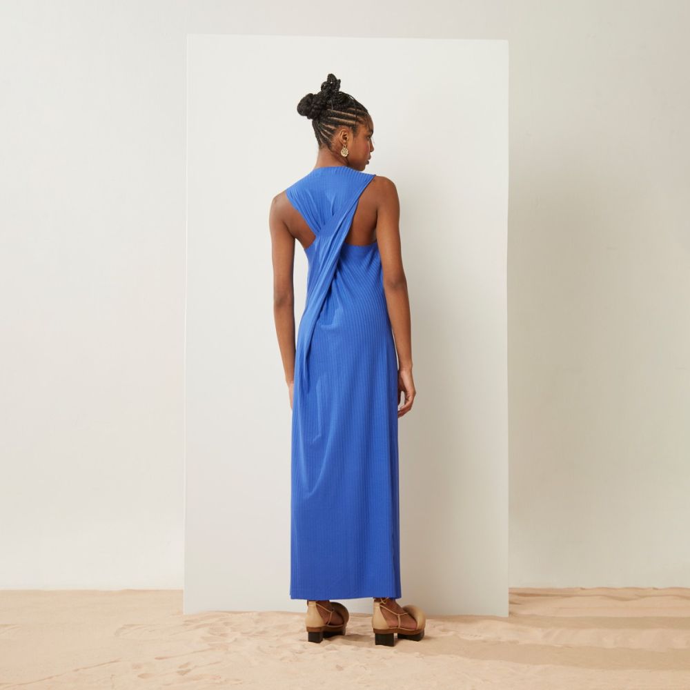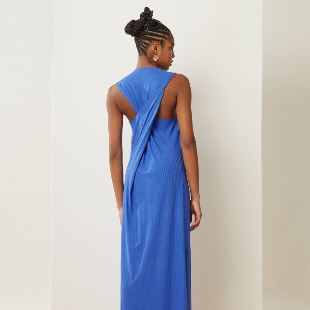 Vestido longo sem manga. Possui uma torção nas costas formando uma dobradura em quase todo comprimento. Aquele vestido que te deixa pronta para qualquer ocasião, vai do chique ao despojado, tudo conforme o calçado e acessório que for usado. A modelo da foto mede 1,80mts e veste tamanho P.